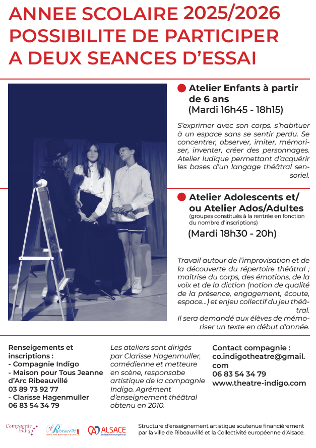 Jouer, imaginer, créer, improviser, apprendre les codes d'un langage théâtral, découvrir des auteurs, des autrices, interpréter un texte, l'atelier théâtre s'adresse à celles et ceux qui ont envie de "sortir de leur coquille", de découvrir ou perfectionner une pratique, de prendre la parole en confiance devant un groupe, et en fin d'année de faire l'expérience de la scène en présentant à leurs familles et ami.es une pièce ou des extraits d'une pièce choisie.