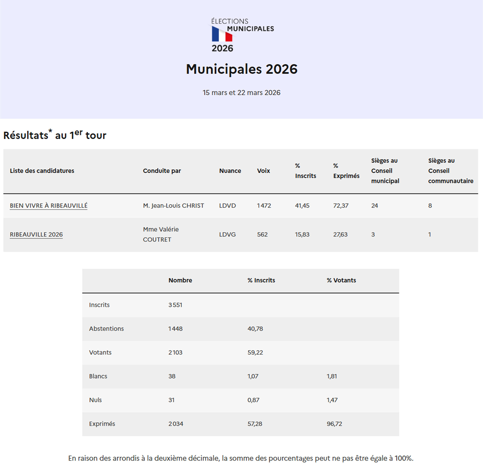 Résultats des votes - Municipales 2026 16 mars 2026 Catégorie : ActualitésAuteur : Ville de Ribeauvillé Ribeauvillé (68269) - Elections Municipales 2026 - Publication des candidatures et des résultats des élections en France