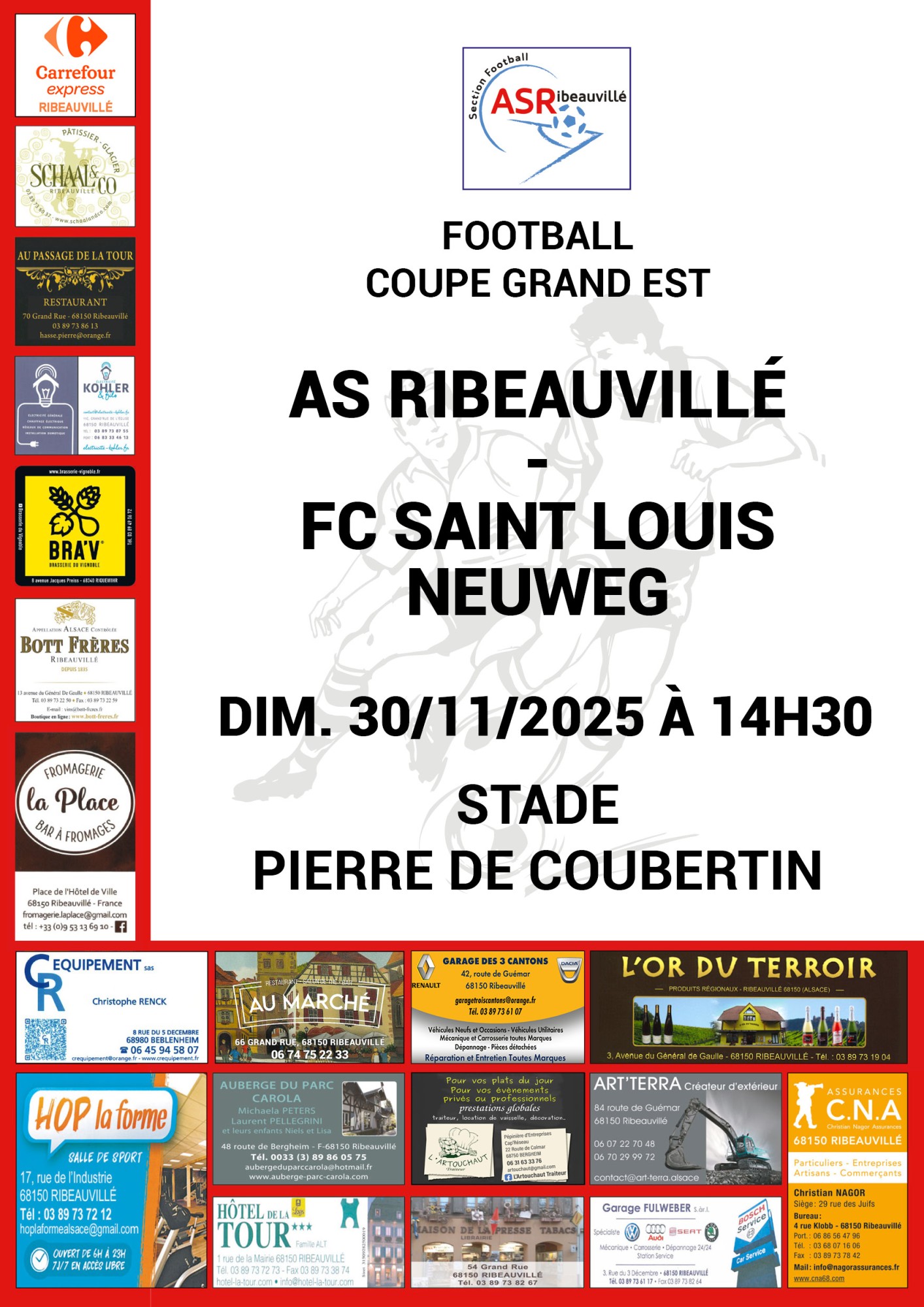 FOOTBALL / AS Ribeauvillé contre FC Saint Louis Neuweg 16 nov. 2025 Catégorie : AgendaAuteur : Coupe Grand Est - 14h30 Stade Pierre de Coubertin Détails de l'évènement : Date : Le 16/11/2025
