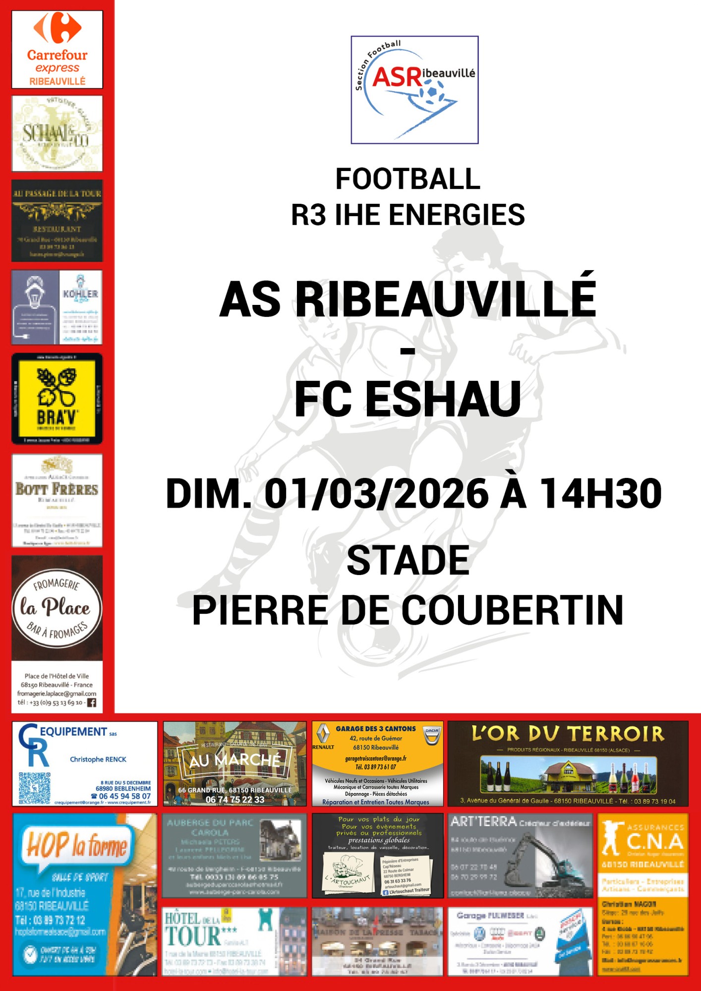 FOOTBALL / AS Ribeauvillé contre FC ESHAU 1 mars 2026 Catégorie : AgendaAuteur : R3 IHE ENERGIES - 14h30 Stade Pierre de Coubertin Détails de l'évènement : Date : Le 01/03/2026