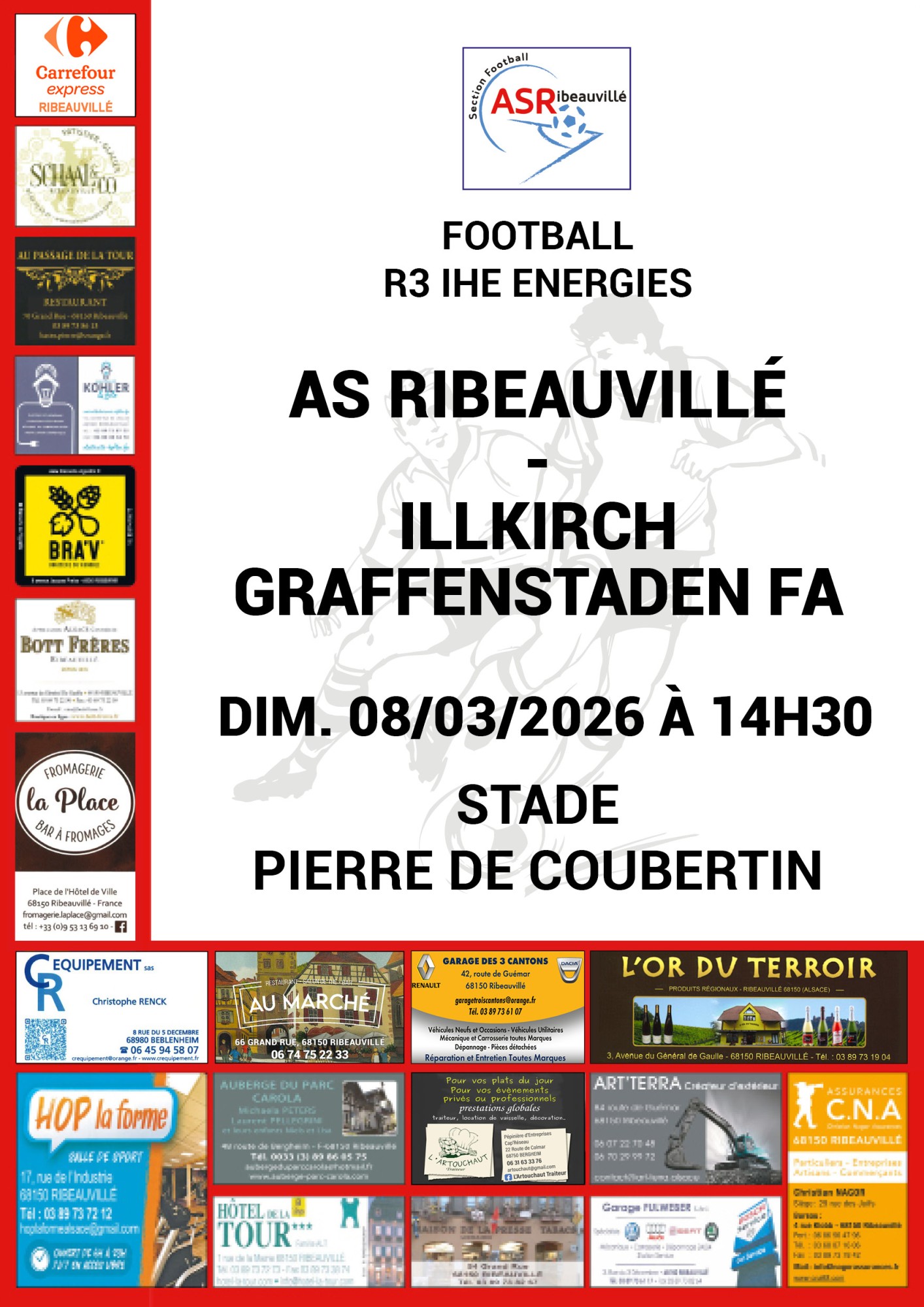 FOOTBALL / AS Ribeauvillé contre ILLKIRCH GRA. 8 mars 2026 Catégorie : AgendaAuteur : R3 IHE ENERGIES - 14h30 Stade Pierre de Coubertin Détails de l'évènement : Date : Le 08/03/2026