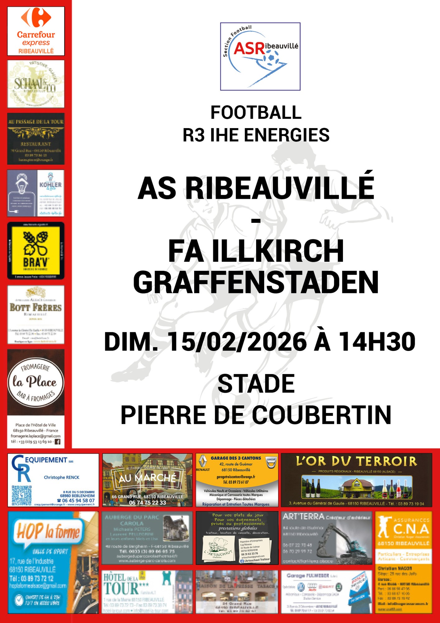 FOOTBALL / AS Ribeauvillé contre ILLKIRCH GRA. 15 févr. 2026 Catégorie : AgendaAuteur : R3 IHE ENERGIES - 14h30 Stade Pierre de Coubertin Détails de l'évènement : Date : Le 15/02/2026