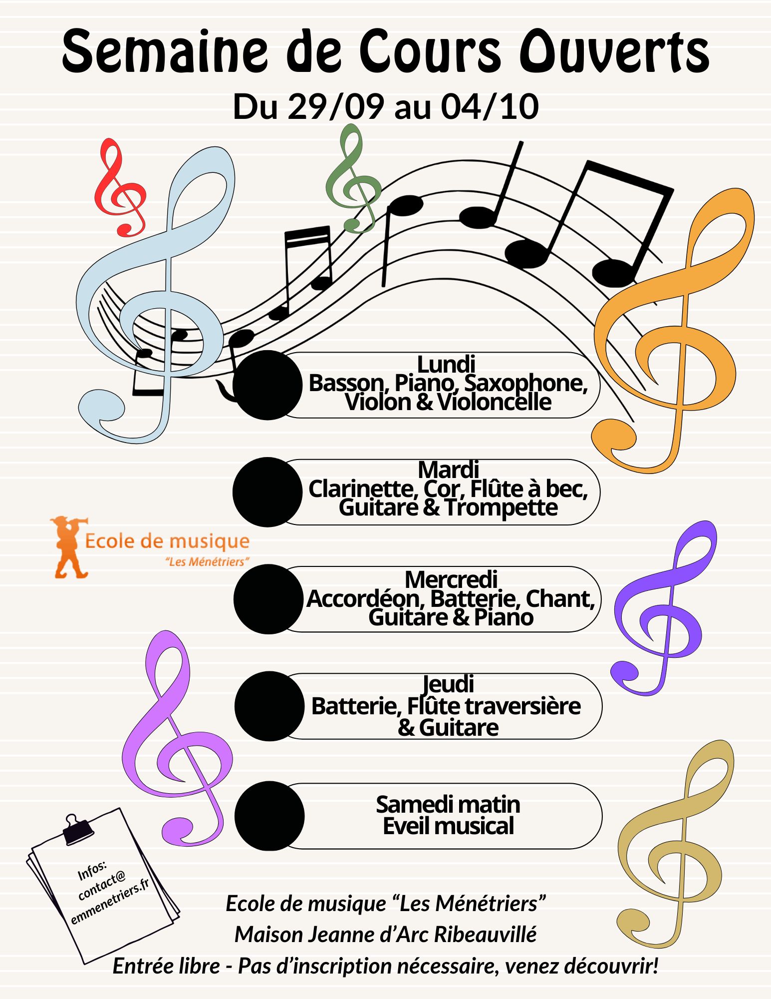 Du 29 septembre au 4 octobre, l’École de musique "Les Ménétriers" organise une semaine de cours ouverts afin de faire découvrir ses activités au plus grand nombre.