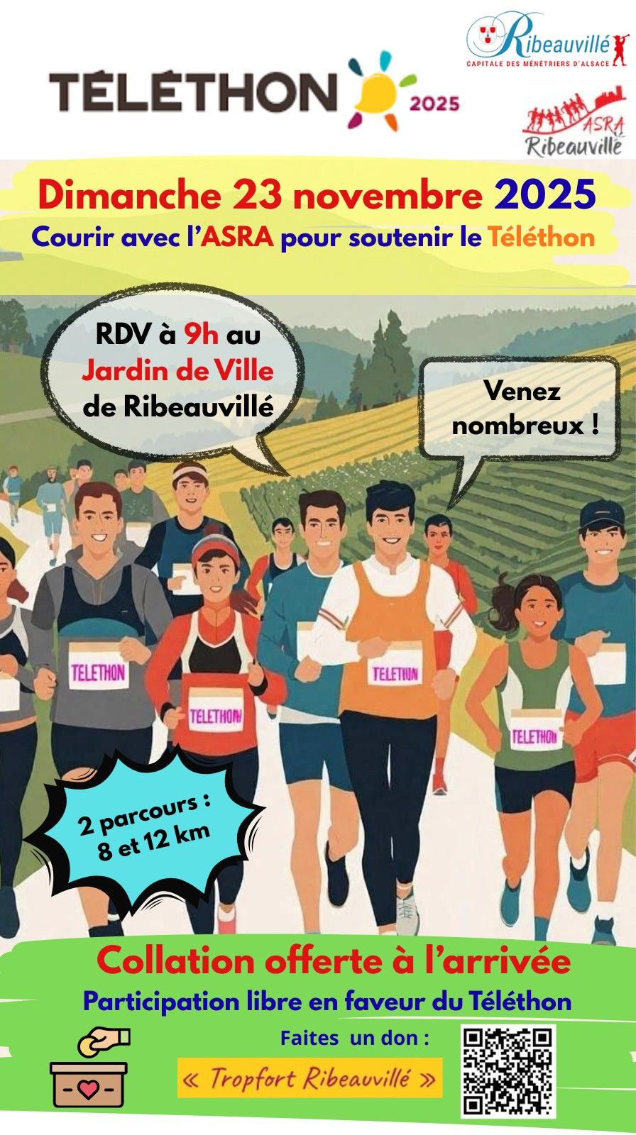 TELETHON : COUREZ AVEC L'ASRA ! 23 nov. 2025 Catégorie : AgendaAuteur : Ville de Ribeauvillé Rendez-vous à 9h au Jardin de Ville Détails de l'évènement : Date : Le 23/11/2025